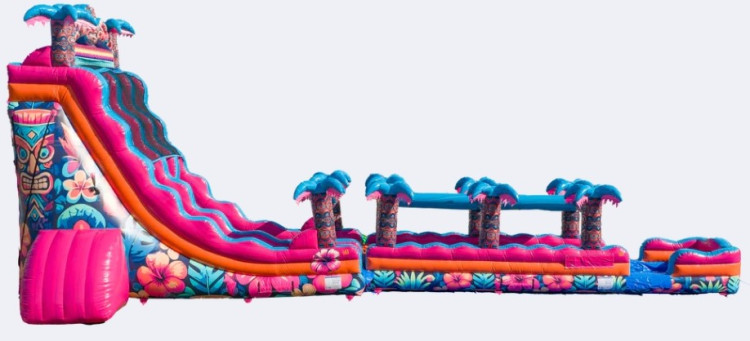 27' Aloha Splash — A vibrant, tropical-themed waterslide rental built for big summer fun. This 27-foot tall inflatable combines a towering slide with a 30' slip n slide splash pool at the base, bright island-inspired colors, and playful hibiscus or palm graphics that set a festive mood for backyard parties, school events, or community gatherings. Designed for multiple riders in sequence, it offers an exciting, gravity-driven ride that accelerates down the slick lane and delivers a safe, splashy landing. Durable, commercial-grade vinyl and reinforced seams make it suitable for repeated rentals; safety features like high sidewalls, a wide climbing ladder with handholds, and a shallow pool area help keep riders secure. Set-up requires a level area and a water hookup or pump to keep the slide slick, and it’s best used on warm days for ages roughly 5 and up (younger children may need close supervision). Ideal for birthday parties, summer camps, fundraisers, or any event that wants to turn up the tropical vibes and cool off with a big, splashy finale.